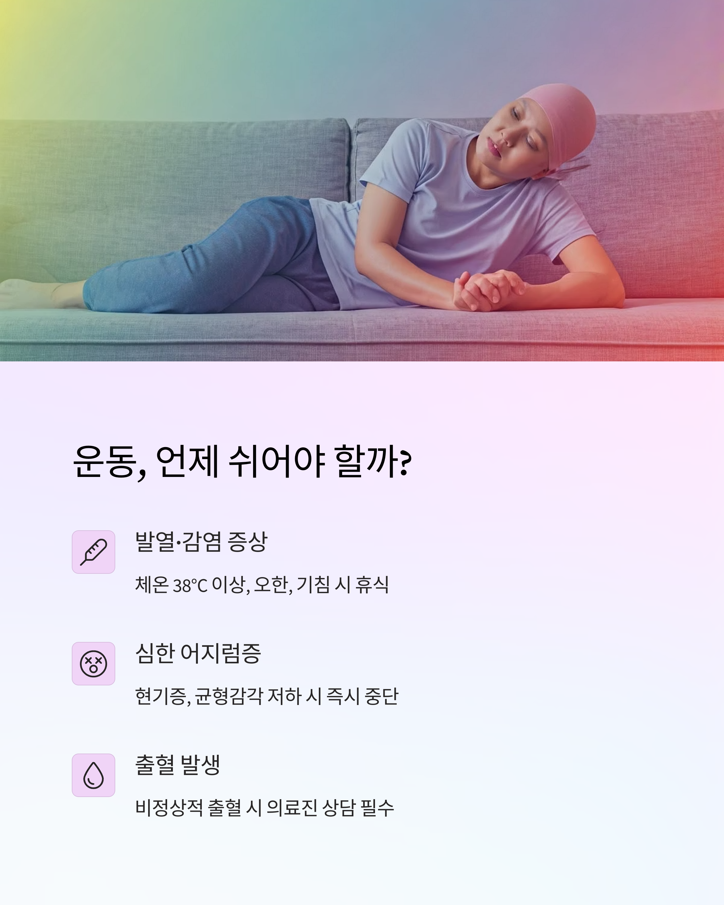 암의 종류와 치료 방법에 따라 운동 시 주의해야 할 점이 다릅니다.